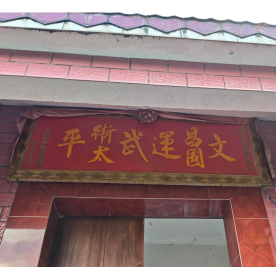 行程第二站是部分代表参观小庙邹氏清朝倡建、现代重修的文武阁,邹秋源、邹石桥等宗亲热情导向、解说。据惠州府志、龙川县志及邹氏族谱记载,倡建者是小庙村邹玉辉(即邹廷琦)等人,我是廷琦公第9代,到此瞻仰,也觉亲切。装有太阳能路灯的三米几宽水泥路弯曲上升,通到山岗顶的文武阁,在不远处就可见阁名、紫墙、琉璃瓦。登阁可环视欣赏四周远近村庄田野景色、远处群山高低错落。门额题写的是“文昌国运,武卫太平”,内设似乎是文曲星、武曲星、神才童子彩瓷塑像供参拜,表达了当地民众对于人民强盛、人才辈出、国家强大的期盼。古代这是风水建筑、教育场所,现今也有很好的景观、教育作用。