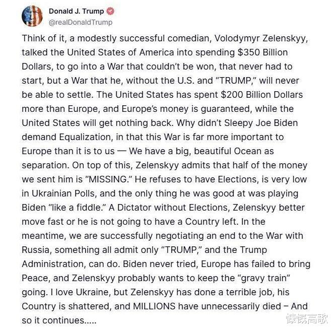 被泽连斯基耍的团团转,也难怪特朗普有些气急败坏,不仅狂怼泽连斯基是个“小有成就的喜剧演员”、“不是由选举产生的独裁者”,他在“在乌克兰民意调查中支持率很低”,称他“唯一擅长的就是将拜登‘像拉小提琴’一样地玩弄于股掌之间”,还说他骗了美国,让其把几千亿美元投进了一场根本赢不了且本就不该开始的战争。