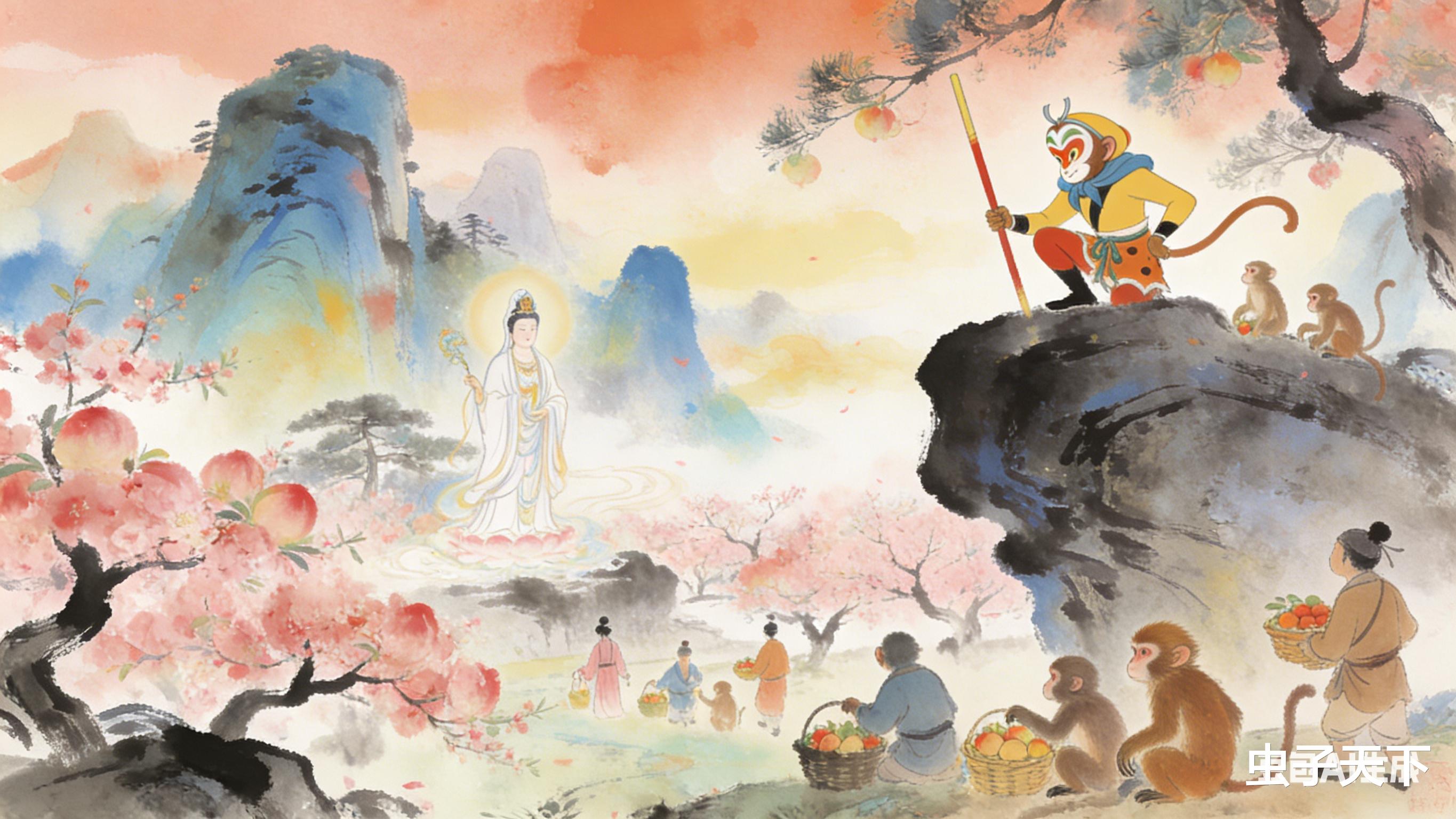 后来,石猴请来观音菩萨,收服了东海恶龙,又劝说村民们合理采摘桃果,不要破坏山林。