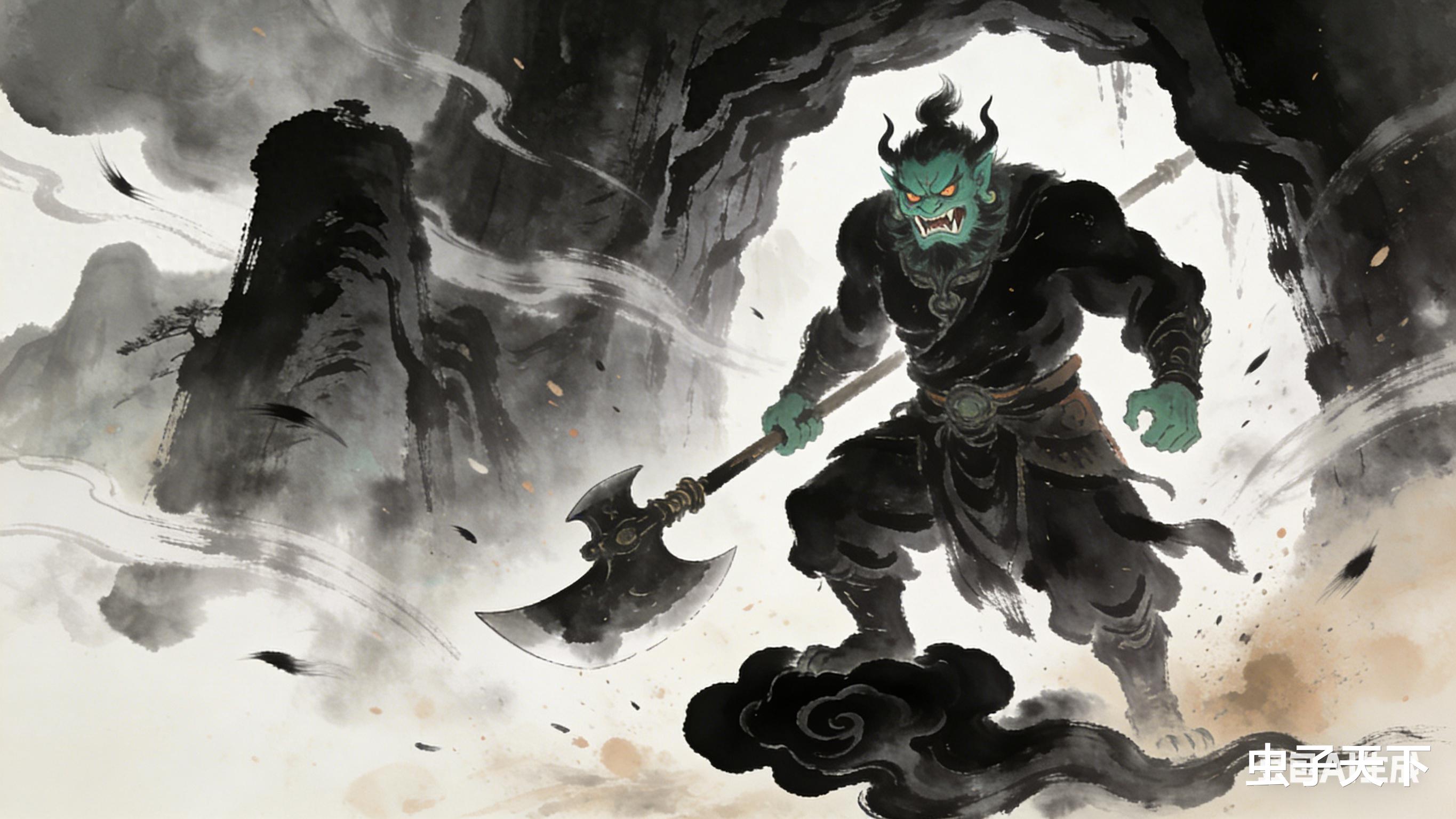 刚到洞口,就见一阵黑风呼啸而出,混世魔王提着宣花斧跳了出来,声如炸雷:“哪里来的毛猴,敢闯俺的洞府?”