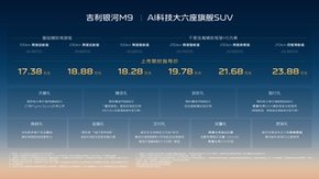 吉利银河M9共推出6款配置车型,分别为210km四驱领航版、230km两驱探索版、230km两驱智航版、100km两驱智航版、以及230km两驱远航版、100km两驱启航版,叠加限时超级置换金10000元权益后,上市限时指导价为17.38万元-23.88万元。