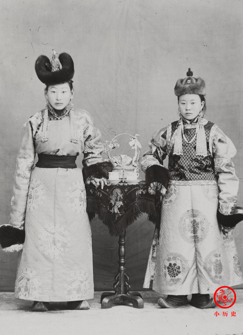 两人年轻漂亮(左一名为金蒑花),穿着华美的蒙古服装,很可能来自定居北京的蒙古王族。