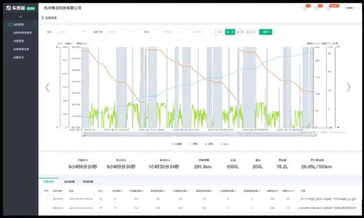加装相应设备后,车智管平台上会显示该车详细的油量消耗变化,并以图表形式直观展现,同时可以与行车里程进行对比分析,帮助管理者判断用油量是否合理。