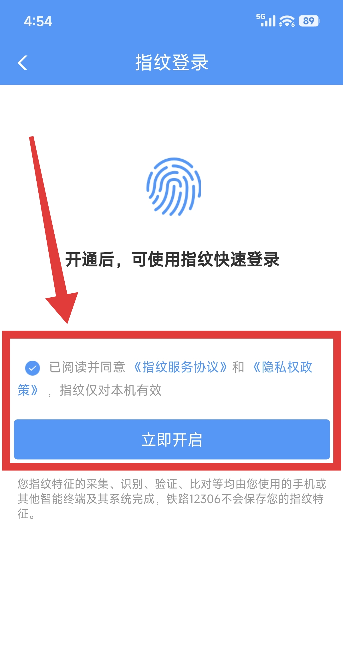 4.到指纹登录页面后,勾选【已阅读并同意】然后点击【立即开启】按钮即可了。
