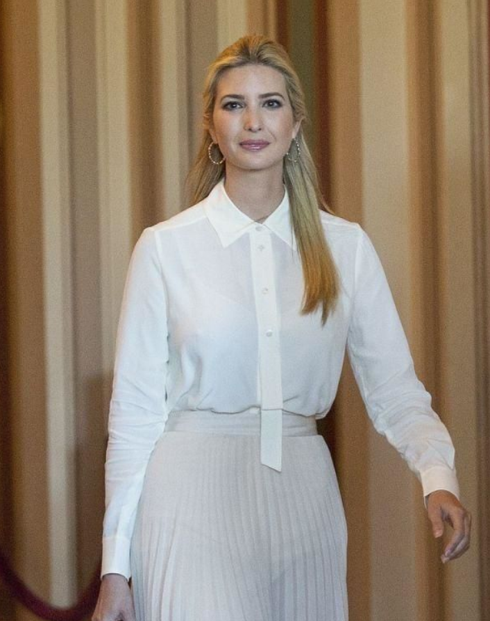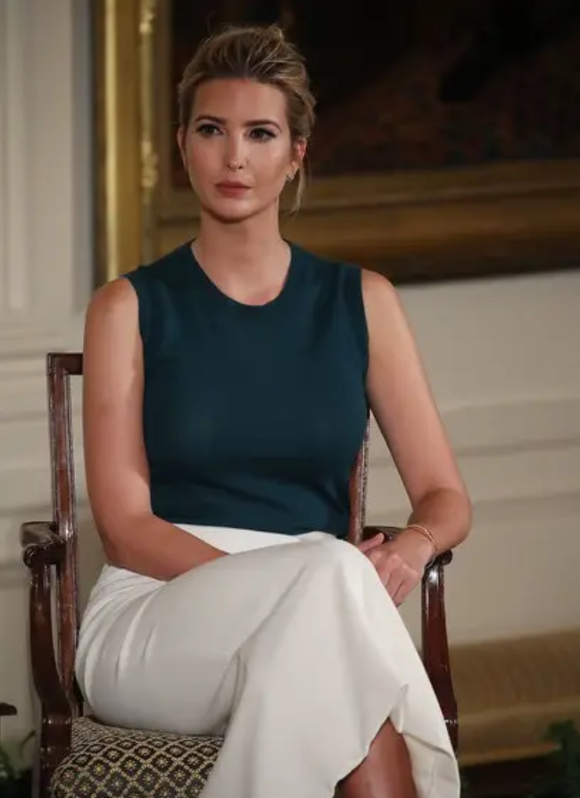 在着装风格上,伊万卡偏爱简约大方的设计,常选择突出腰线的连衣裙或高腰裤装,以纯色为主调,偶尔用配饰如腰带或胸针增添亮点。