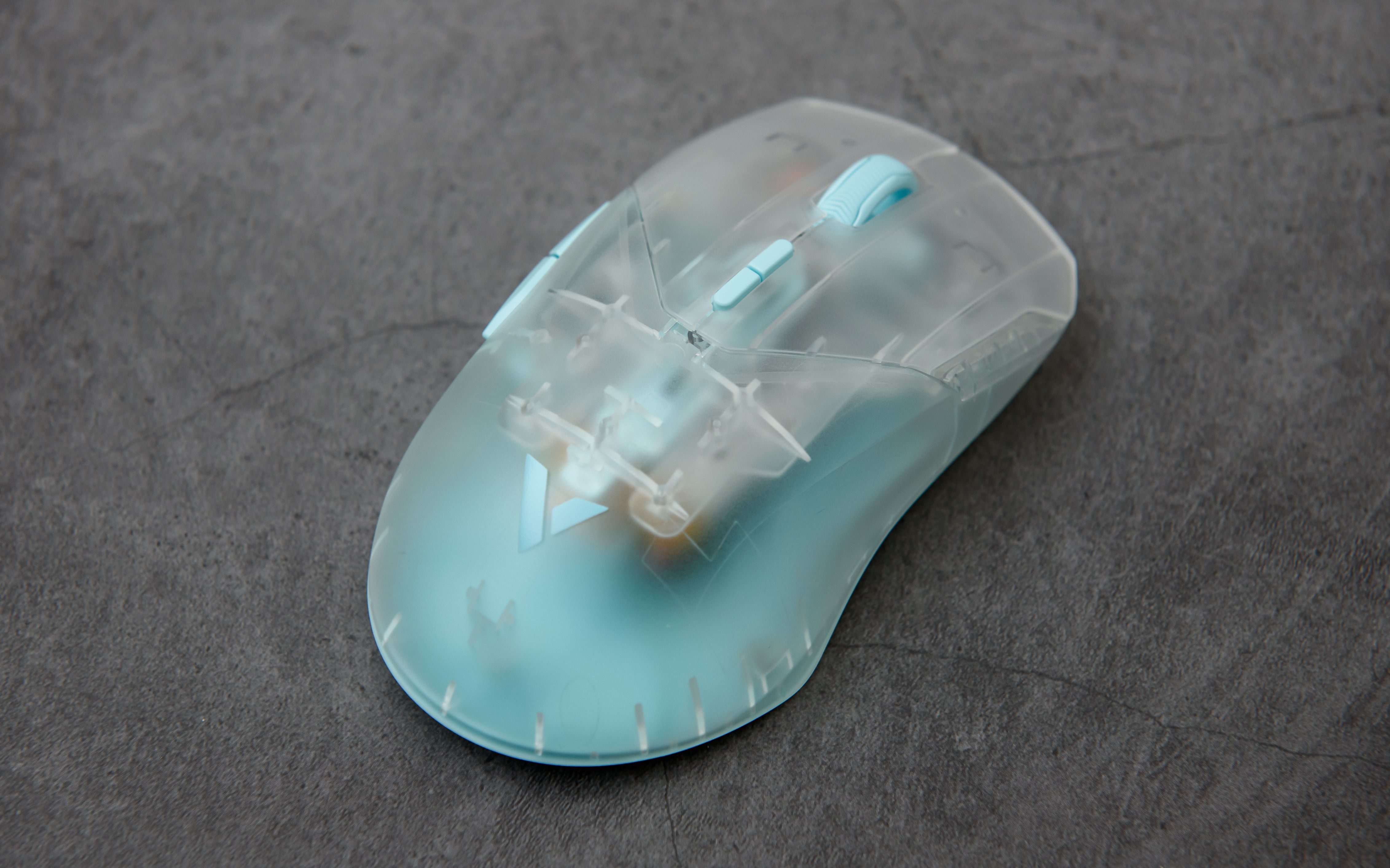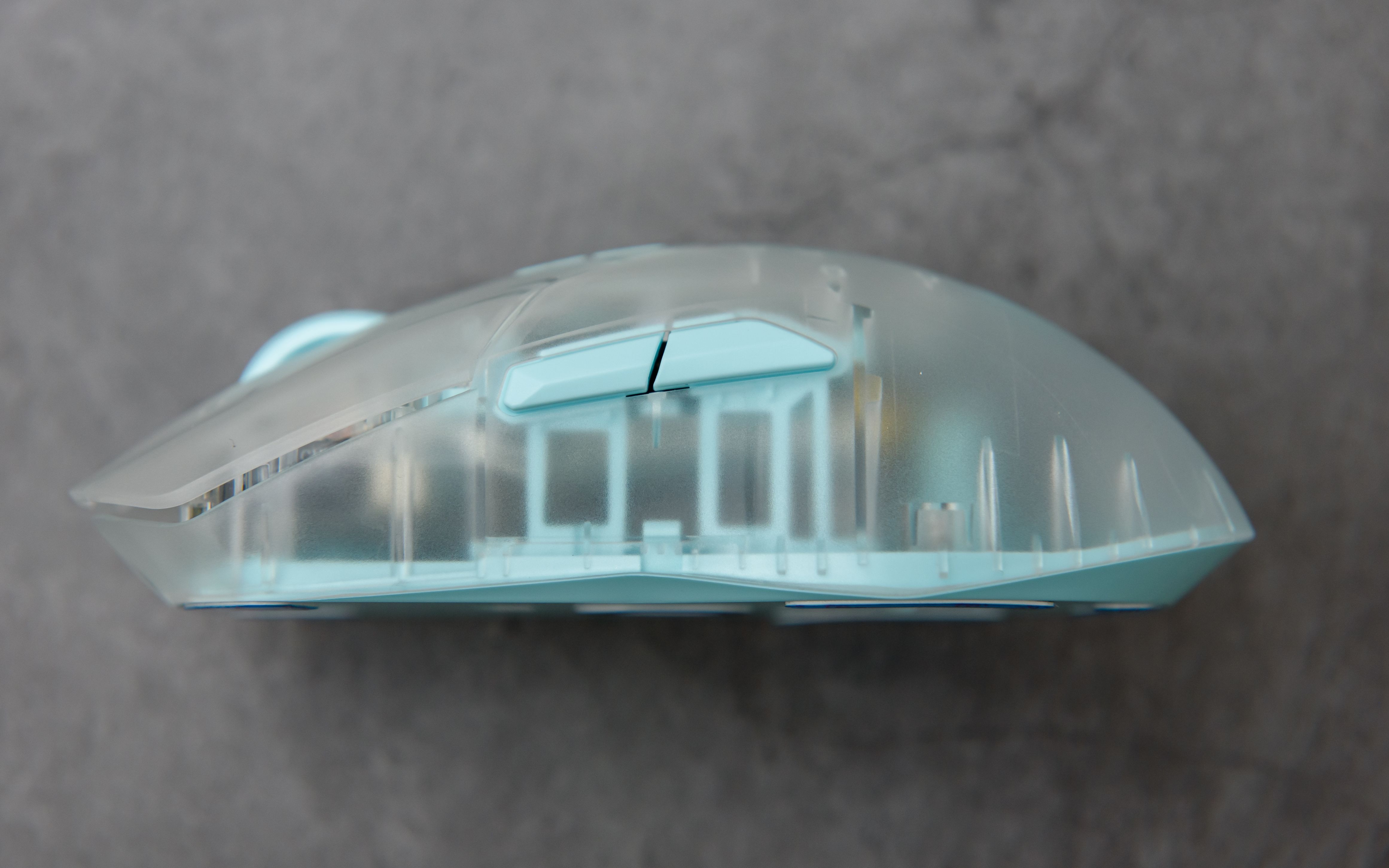 ▼雷柏VT9 Air依旧为右手对称设计, 在材质上进行极大的变动: 透明款VT9 Air鼠标使用了磨砂质感的半透明壳体,鼠标滚轮, 按键及底板均为天蓝色, 鼠标手感细腻, 内部零件及壳体的加强筋隐约可见 , 从另一方面反映出来雷柏对自家产品做工与品质的自信. VT9 Air系列有极光(蓝),星霜(紫),隐墨(灰),月蚀(白),暮影(黑)共5中配色, 我手中的是极光(蓝), 还是非常耐看的.