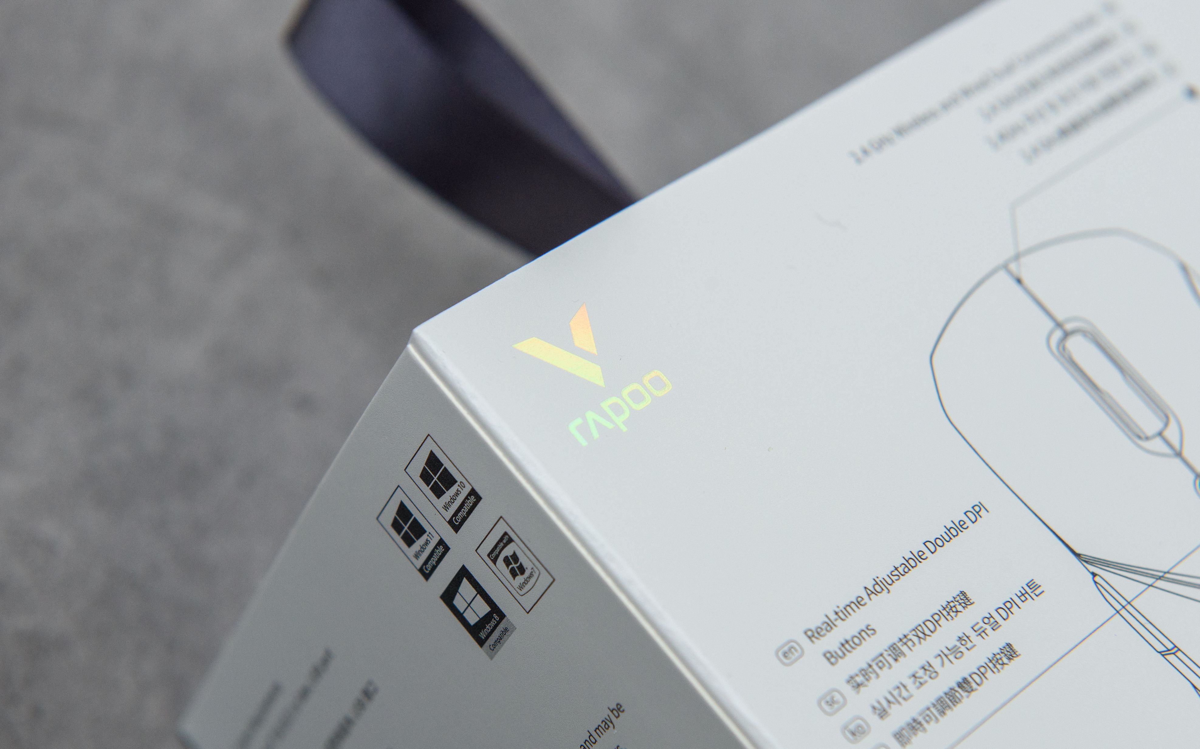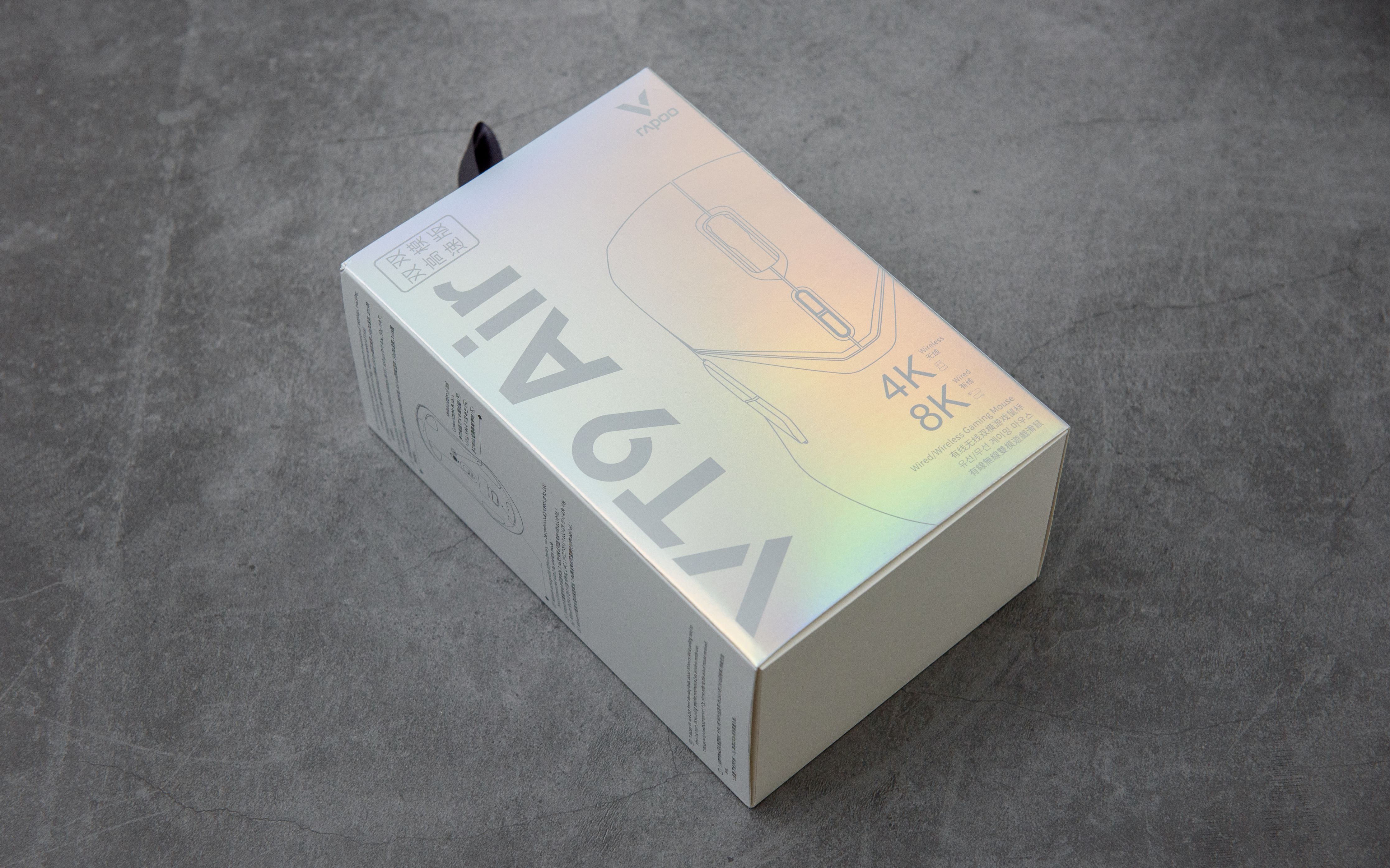 开箱:▼为了彰显VT9 Air的与众不同, 雷柏在包装盒上也是下足了功夫: 包装盒正面及背面的雷柏LOGO特意使用了亮银镭射涂层, 在光照下非常的炫彩夺目