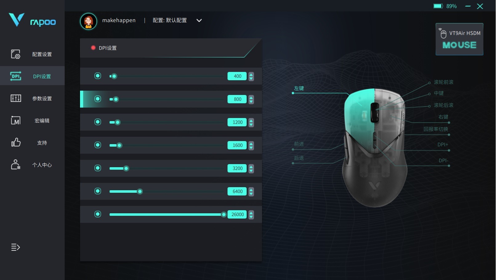 ▼鼠标安装测试驱动后, 玩家可以对DPI进行设置, 所有按键均可通过驱动进行自定义且支持宏编辑并可将设置保存在云端