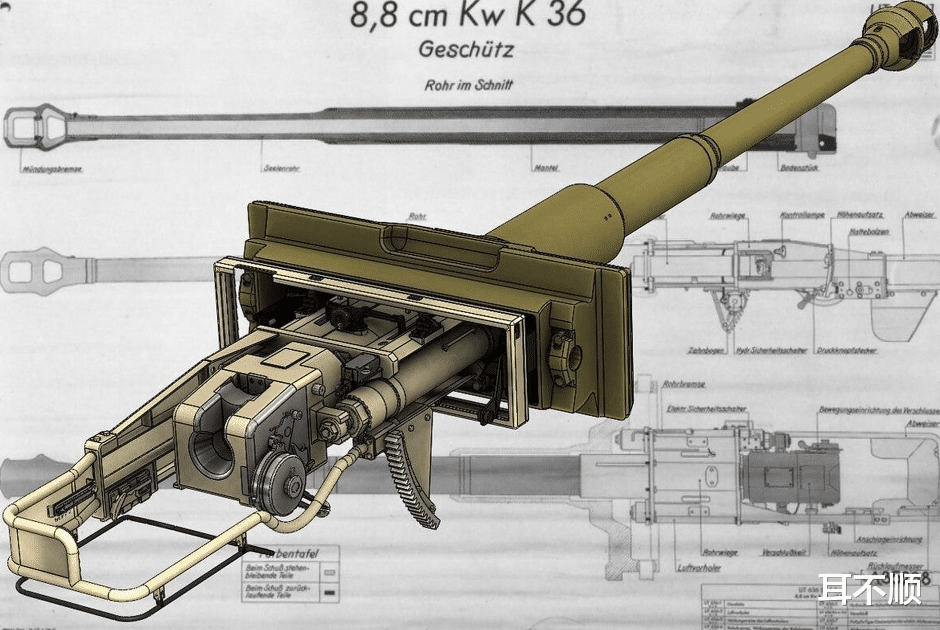 制造“虎式”炮塔的任务,交给了德国莱茵金属公司,“虎式”主炮使用88毫米高射炮改造的Kwk36火炮,88毫米口径,56倍径。