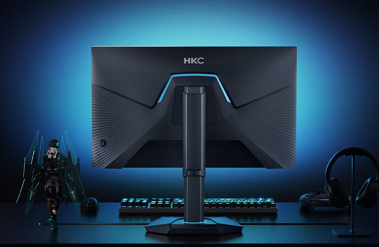 外观方面,HKC G25H5延续了猎鹰系列的硬核设计语言,哑光黑机身搭配蓝色饰条,背部猎鹰浮雕纹理强化品牌辨识度。支架依然是备受好评的升降旋转支架和六边形小巧底座,调节方便且省桌面空间,可轻松融入各种电竞场景。