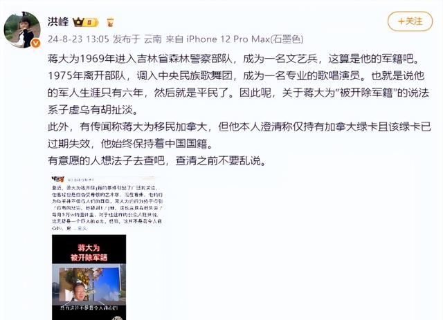 然而,多年来他却一直被各种不实传闻所困扰,“被开除军籍”“持国外绿卡”“骗财骗色”等标签,如乌云般笼罩着他,让公众对他产生了诸多误解 。