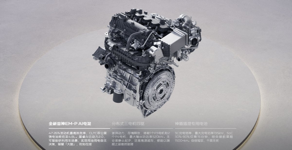 安全更是不打折扣。高强度星甲笼式车身+9个安全气囊(含同级独有的双腔远端气囊),从侧面到前排都能护住;神盾电池经过“六大魔鬼串行测试”,连整车底部碰撞都扛得住,雨天跑高速也放心。动力上,雷神EM-PAI电混系统让馈电油耗仅4.8L/100km,两驱版综合续航超1500km,全家跨省旅游不用频繁找充电桩。