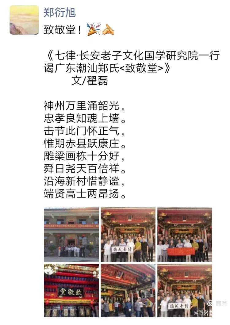 著名文化学者、西安老子学院院长李醉一行,参访拜谒广东潮阳郑氏祖祠“致敬堂”,感受历久弥香的郑氏宗祠文化,受到以爱心企业家郑衍旭先生为首的郑氏宗亲的热情接待,双方进行了深入广泛的宗祠家风文化交流。