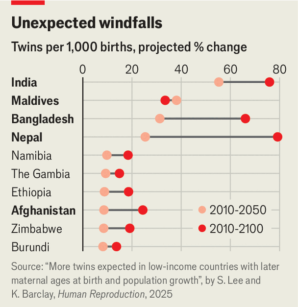 马克斯·普朗克研究所的Susie Lee和斯德哥尔摩大学的Kieron Barclay的预测模型显示,到2050年,印度双胞胎出生率可能增长超过50%。在他们的模型中,仅基于孕产妇年龄变化这一因素,出生率就将从2010年每千名新生儿7对增至2050年的11对。