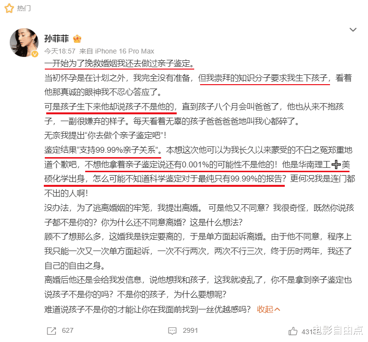 在这场离婚风波中,最令人震惊的是她为挽救婚姻曾做过亲子鉴定。即使科学证据摆在眼前,她的丈夫仍以“0.001%的可能性”为由拒绝承认自己是孩子的父亲。