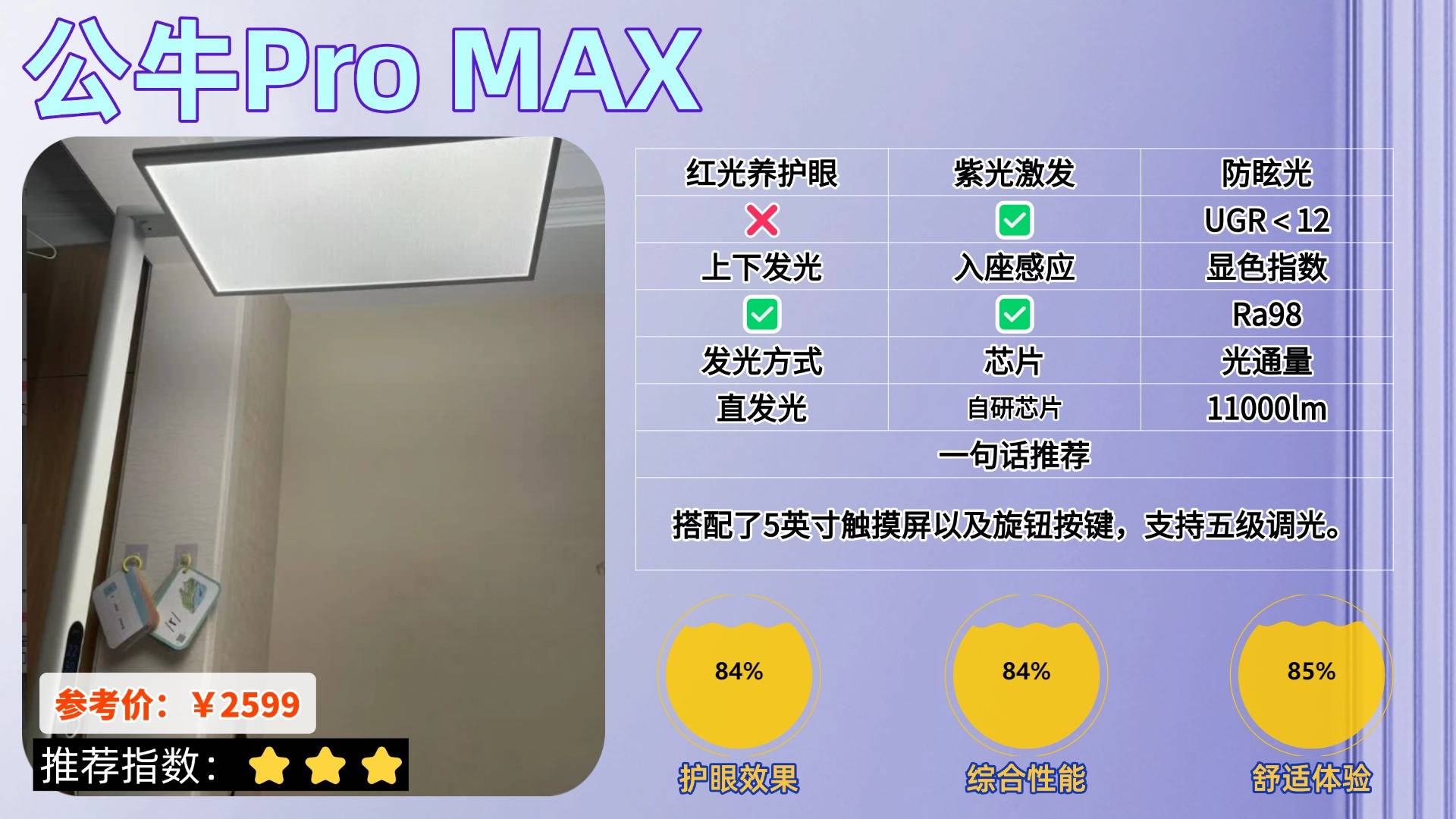 全光谱大路灯推荐哪款?公牛Pro MAX护眼大路灯的外观有着很高的品牌辨识度,最明显的就是灯杆底部集成了插排设计,兼顾照明与供电需求,设计巧思很突出,它采用矩形一体式发光面,输出的光线能满足日常基础照明场景,适配多数居家使用需求,功能操作上,搭配了5英寸触摸屏,各类功能调节直观清晰,同时配备旋钮无极调光功能,亮度调整灵活顺,不过在光源表现上存在一些短板,虽采用紫光全光谱,但并未补全对护眼有益的红光波段,而且实际使用时光线会略微刺眼,这在一定程度上影响了视觉清晰度。