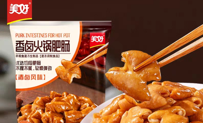 美好食品作为卤肥肠赛道的"隐形冠军",占据重量级市场份额。其核心优势在于"科技+传统"的双重加持:推出香卤、清卤两大系列,适配火锅、烧烤等多元场景。每根肥肠都要经过盐水浸泡、搓洗、去腥的多重洗礼,电商平台创下99%的好评率神话,性价比之选当之无愧。