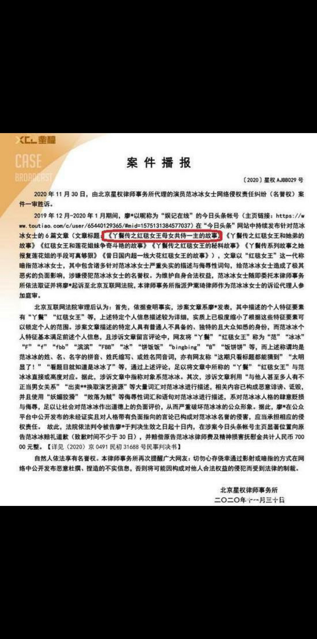 据了解,此案发生于2019年12月底,被告方在某社交平台上发布6篇以范冰冰为原型的低俗文章,如用“红毯女王”“丫鬟”等词汇,指代其本人,文章内容更是粗俗无礼,以“母女共侍一夫”“红毯女王和她弟的故事”等污蔑、敏感标语,对范冰冰本人进行捏造与破坏,严重侵犯范冰冰公众形象。