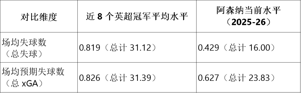 过去8个英超冠军中,有5个冠军球队是“联赛丢球最少”的球队;但近两个赛季,阿森纳虽以“丢球最少”收官,却均屈居亚军。本赛季,他们有足够空间去超越近年冠军球队的平均防守数据——其预期失球数(xGA)也远超“夺冠球队所需的典型水平”。