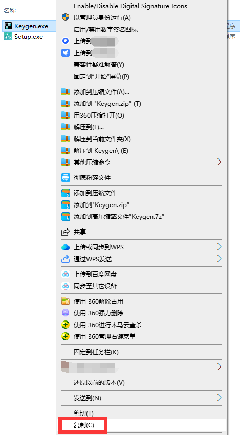 7、回到最开始解压出的文件夹,找到【Keygen】文件,鼠标右键,选择【复制】。