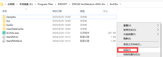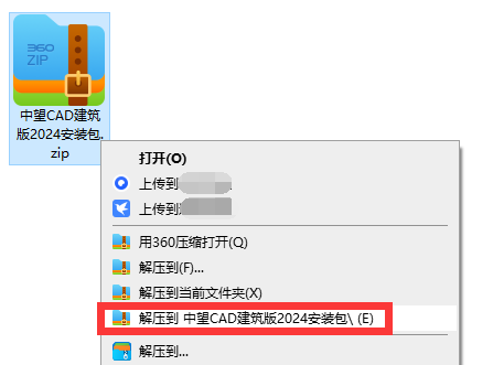 安装步骤:1、得到压缩包之后,鼠标右键解压,点击【解压到中望CAD建筑版2024安装包】。