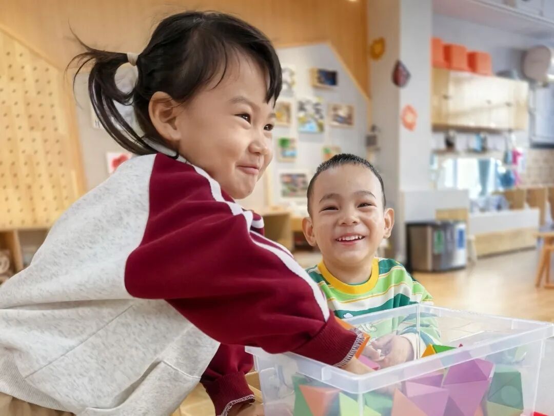 在这里,教室变成了温暖的“家”让空间属于每一个孩子:低矮开放的柜子、软乎乎的地垫、错落有致的小天地。孩子们有时席地而坐拼积木,有时躺下来看落叶跳舞,玩到兴起就打个滚,或者拉起小伙伴的手冲向那筐新毛线球——身体越自在,心灵越舒展。当环境足够安全与包容,内在的好奇与勇气便会悄悄发芽:他们在这里扎根对“家”的归属感,也长出对世界的信任感。