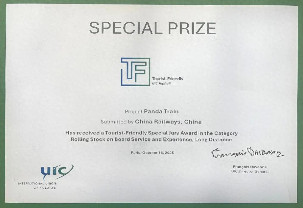 记者今日获悉,在巴黎举办的国际铁路联盟(UIC)首届“游客友好型铁路服务与体验奖”颁奖仪式上,由中车成都公司设计制造的“熊猫专列”,荣获“长途旅游友好型列车及车上服务评审团特别奖”。