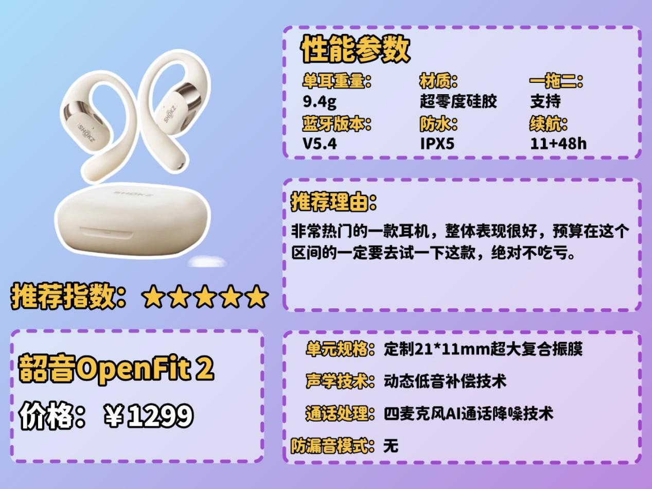 总结:韶音 OpenFit 2 作为高端机型,是真的没让人失望,音质、佩戴感、续航都顶尖,预算够的话,选它绝对能享受到好的使用体验,闭眼入不踩坑!