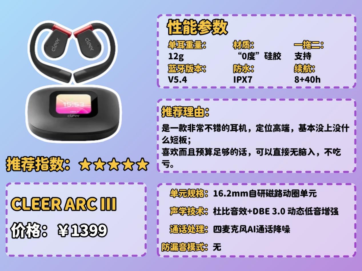 总结:要是你预算够,想买个各方面都拔尖的开放式耳机,CLEER ARC III 绝对值得考虑,毕竟旗舰款的实力摆在那儿,用着肯定舒心!