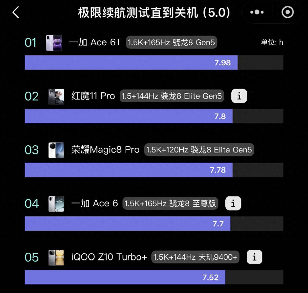 在今年最新第三方媒体发布的手机续航评测中,一加 Ace 6T 以绝对优势冲上榜单第一,成为目前“续航最强”的手机。是的,你没看错——不是某款大电池直男旗舰,也不是延续传统的长续航老将,而是这款定位次旗舰、但实力堪比超级旗舰的一加 Ace 6T。