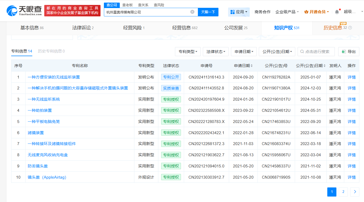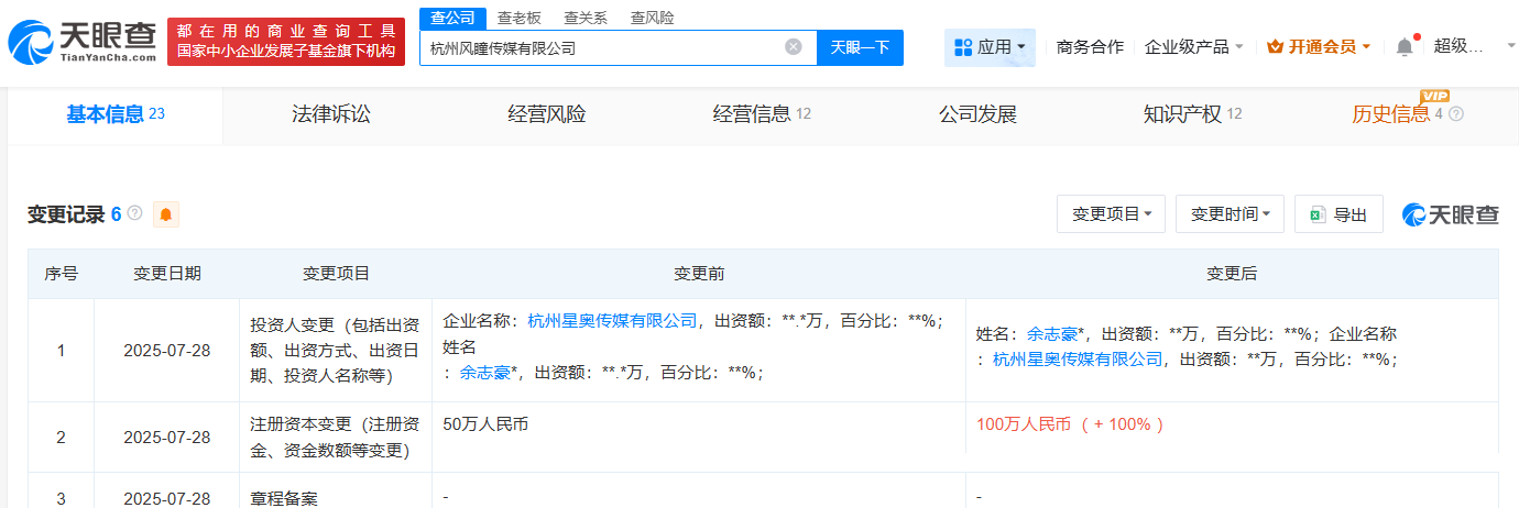 天眼查App显示,影视飓风关联公司杭州星奥传媒有限公司成立于2016年8月,法定代表人为潘天鸿(Tim),注册资本约105万人民币,经营范围包括广播电视节目制作经营、电子出版物复制、电子产品销售等。股东信息显示,该公司由潘天鸿、潘水苗、赵敏等共同持股。对外投资信息显示,该公司持有2家存续公司股份,其中杭州风瞳传媒有限公司注册资本于今年7月由50万人民币增至100万人民币。知识产权信息显示,该公司已申请多枚“影视飓风”“无限进步”等商标,并拥有多个专利。