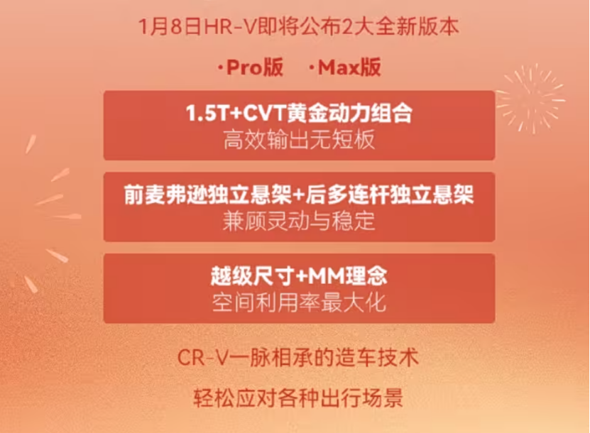 根据已透露信息,新一代SU7将全系标配激光雷达和4D毫米波雷达,配合700TOPS算力的旗舰芯片,实现全天候、全场景的精准环境识别。同时,新一代SU7续航里程也将进一步提升,标准版从700km升级至720km,Pro版从830km升级至902km、Max版从810km升级至835km。小米今年以来风评屡屡受挫,亟需通过新车提振信心,新一代SU7的产品力提升,或许是一个不错的契机。03合资品牌:开始打“反击战”面对新能源的冲击,合资近几年的发展面临严峻考验。好在,2026年不少合资车企也开始行动起来,稳定燃油基本盘的同时,也在新能源领域发力,“反击”意味明显。根据相关信息,2026款本田HR-V将于1月8日上市,虽然价格尚未公布,但官方表示将公布诚意十足的价格,或将比现款车型的售价更加惊喜。从已透露的信息中看,新车与现款HR-V外观设计保持一致,彰显的还是运动气质。值得注意的是,新车长宽高分别为4569/1840/1611mm,轴距为2655mm,采用本田MM理念实现了空间利用率最大化,或比一般的紧凑型SUV体验更好。