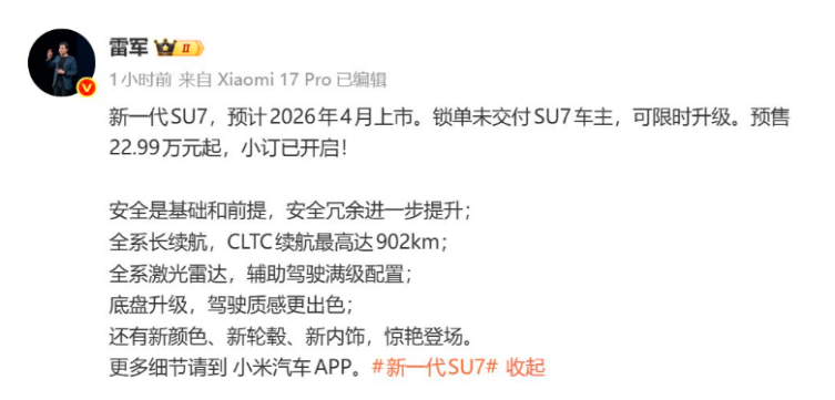 作为业内“黑马”,1月7日,小米汽车宣布,新一代SU7开启小订。新车提供三个版本,预售价分别为标准版22.99万元、Pro版25.99万元、Max版30.99万元。对比老款SU7,新一代SU7标准版和Pro版售价上涨了1.4万元,Max版上涨了1万元。
