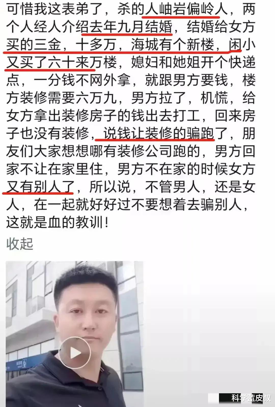 网上有人自称是李某胜的亲属,声称结婚的时候,男方也按照一婚买了三金。婚后出门打工,回家的时候发现被骗了。