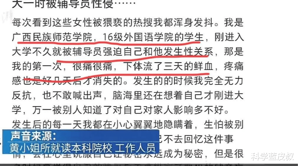 广西一毕业女生控诉大一时被辅导员强奸!那是她的初夜,下体流血3天!该涉事老师已被停职…刚刚得到消息,广西民族师范学院一毕
