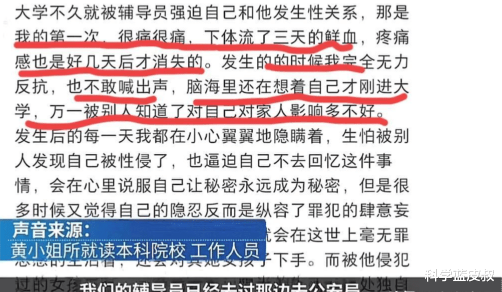 据爆料人黄小姐表示,她刚入校没多久,就被班上辅导员强奸。那是她人生的第一次,好痛好痛,下体流血持续了3天。后来疼痛感才慢慢消失!