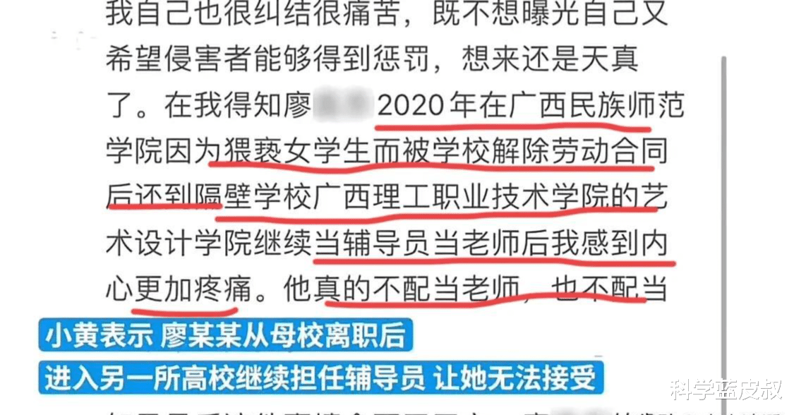 从黄小姐的描述来看,这个廖老师在2020年因为猥亵女生的行为被学校开除。后来又去了隔壁的广西理工职业技术学院当老师。