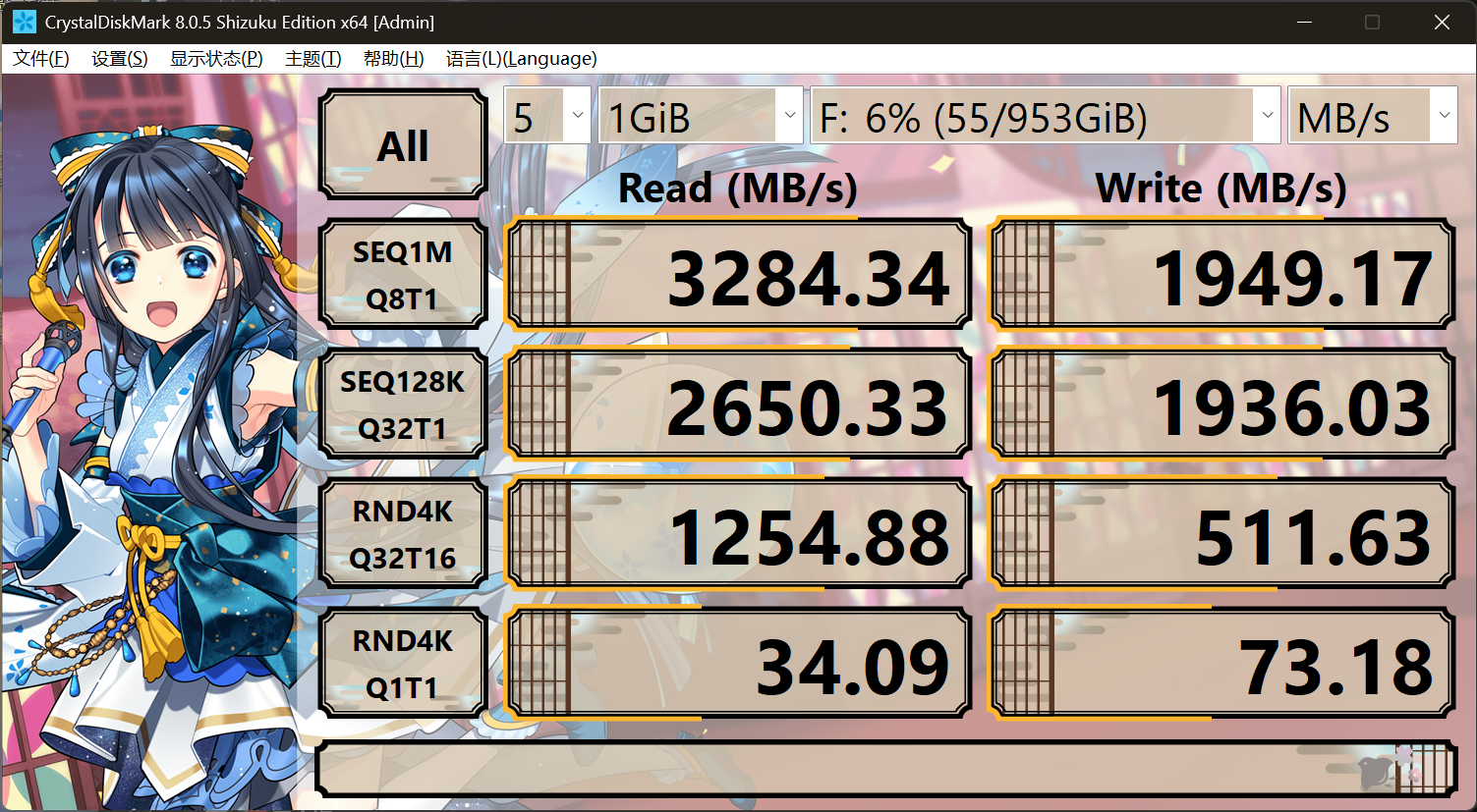 我们将它连接到配备了雷电5接口的笔记本上,测试一下内置硬盘的速度吧。 先是CrystalDiskMark,从上图片中,我们可以看出,它的读取速度为6822.55MB/s,写入速度为1941.72MB/s。不过,这里面的读取速率较低,可能是由于测试软件算法与雷电5的匹配存在问题。
