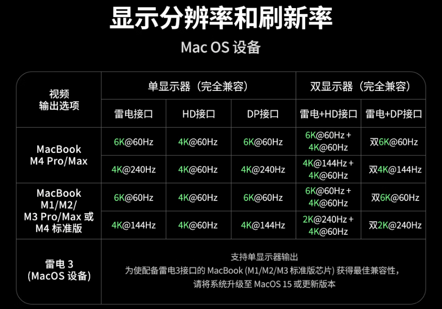 磐镭Link G2E雷电5拓展坞!通过HDMI、DP2.1和雷电5,支持最多三台设备的不同画面显示。且支持Mac及Windows系统,不同分辨率下的多种刷新模式,具体可以参看上面的表格。