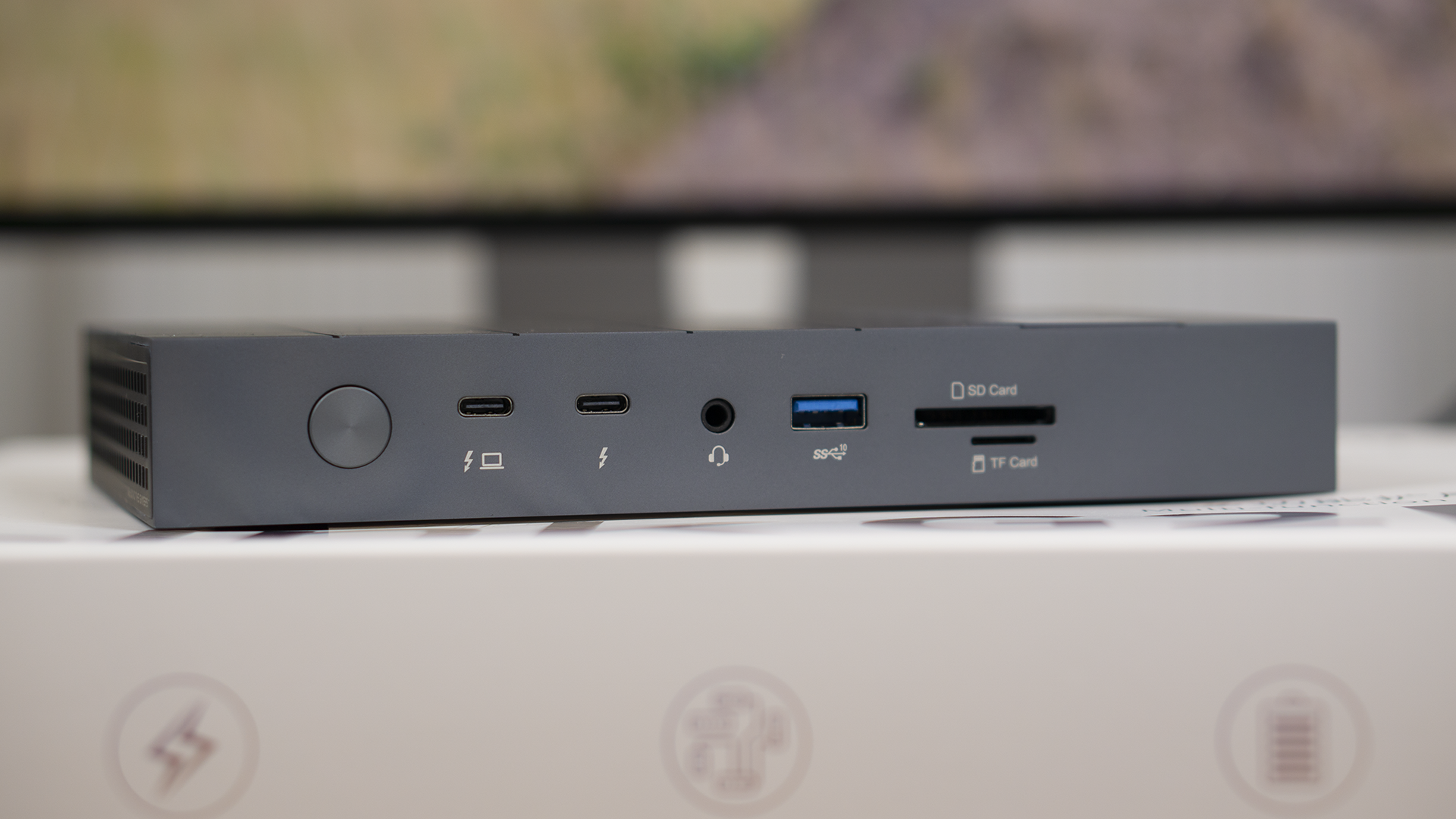 它的正面从左到右分别是,一个电源按键、一个雷电5上行接口、一个雷电5下行接口、一个耳机接口、一个USB-A 3.2 Gen2、一个SD4.0、一个TF4.0接口。