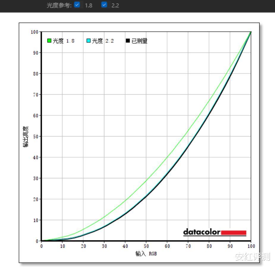 色调响应测试,川升CS3228的伽马曲线与伽马2.2曲线几乎完全重合,因此显示器在使用时,还原度非常高,显色自然真实。