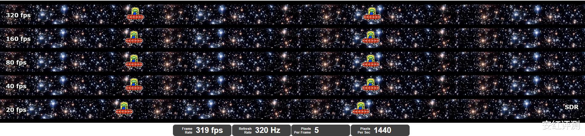 如果玩竞技类游戏,追求更高的刷新率,则可以切换到FHD 1K@320Hz模式。每秒呈现320帧新画面,带来更加流畅的视觉体验。在UFO测试中,高速飞行的小飞碟显示正常,白色方框清晰可辨,并未因高速飞行而成线。同时画面测试也没有变形、拖影的表现。