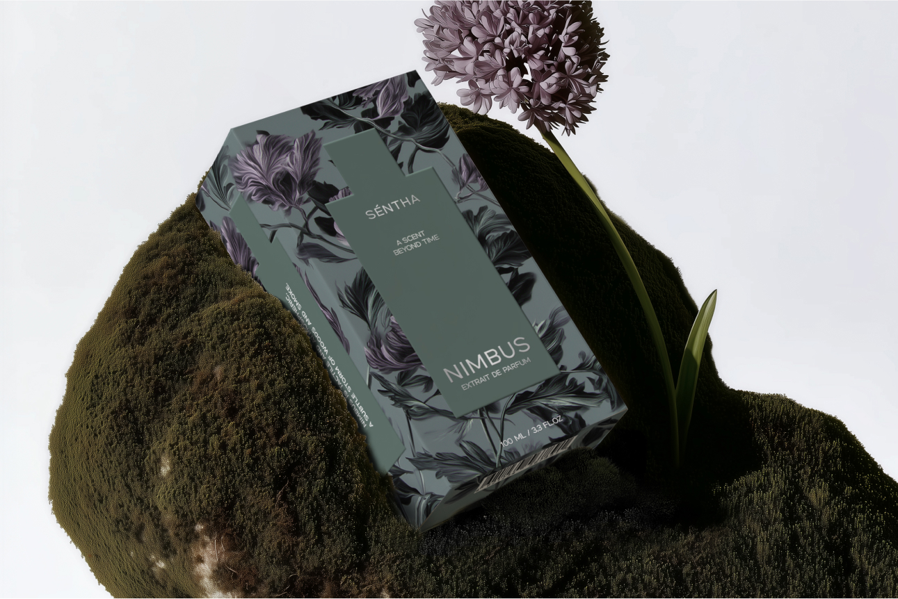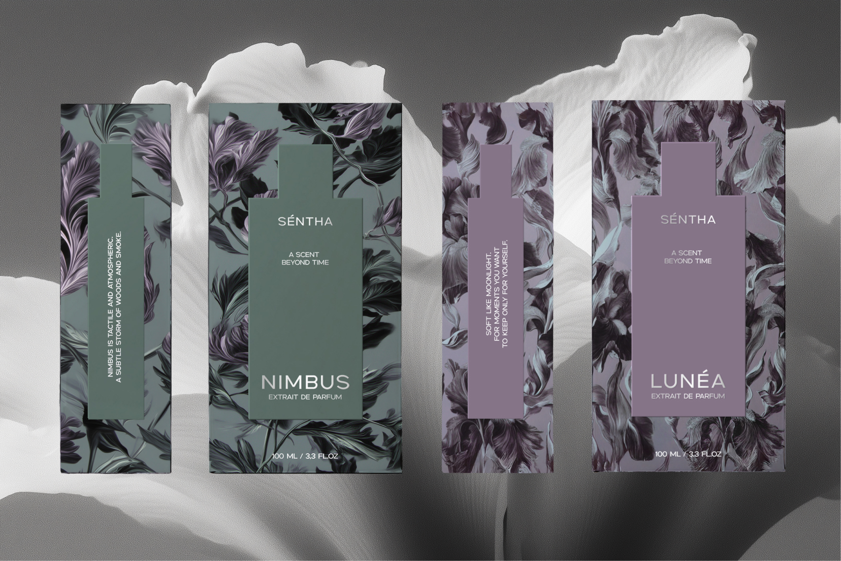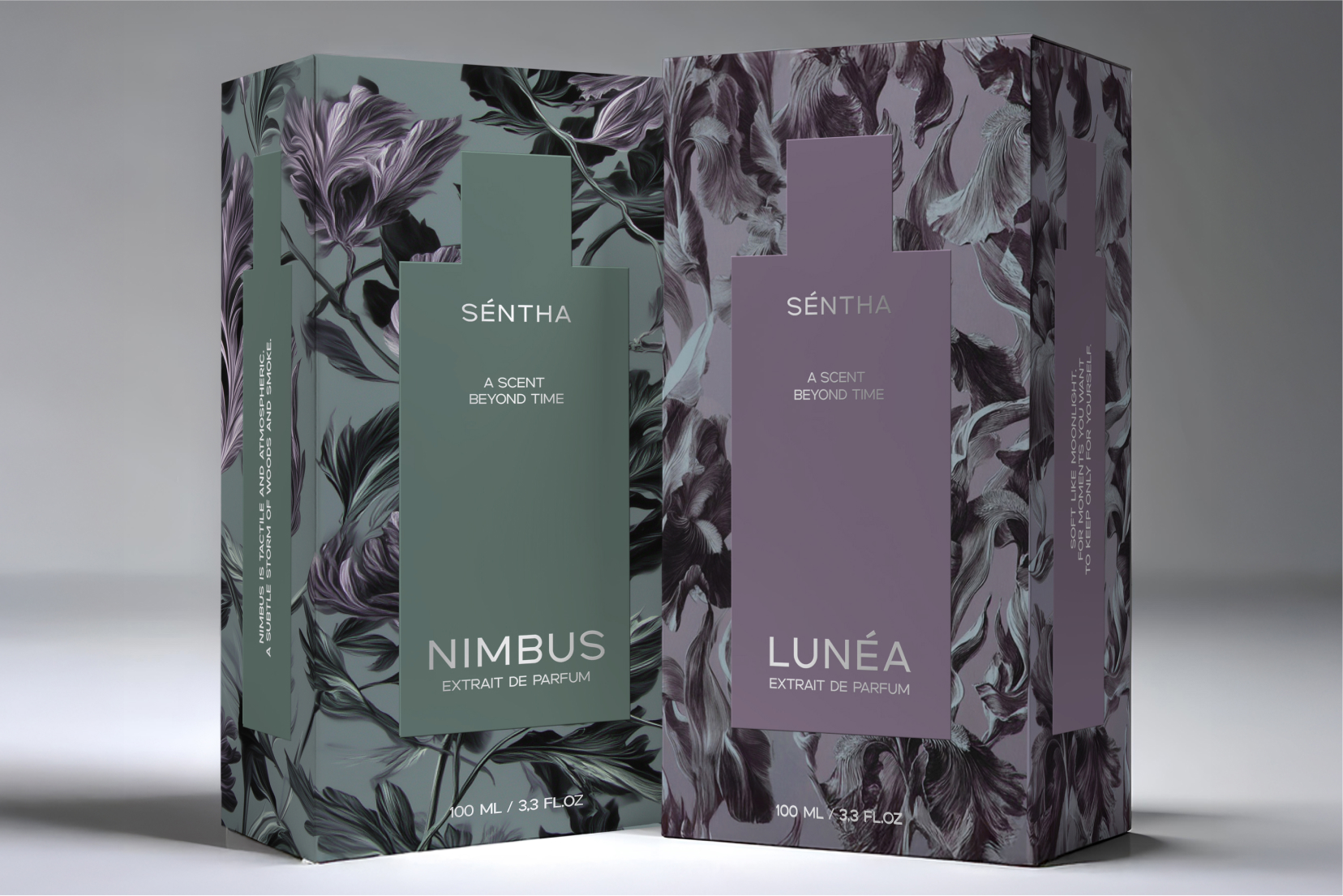 SENTHA的香水包装宛如一幅神秘的暗夜画卷。以深紫色和绿色为主色调,搭配上深邃神秘的花卉图案,仿佛将一片幽静的花园浓缩在了方寸之间。包装上的花卉线条细腻且富有动感,像是随风摇曳的精灵,为整体增添了一份灵动之美。标签部分简洁大方,与繁复的花纹形成鲜明对比,既突出了品牌和产品名称,又不会让包装显得过于杂乱。这种将自然元素与现代设计手法相结合的方式,让包装不仅是一个容器,更是一件值得收藏的艺术品,还未打开香水,就已被这独特的视觉魅力所俘获。