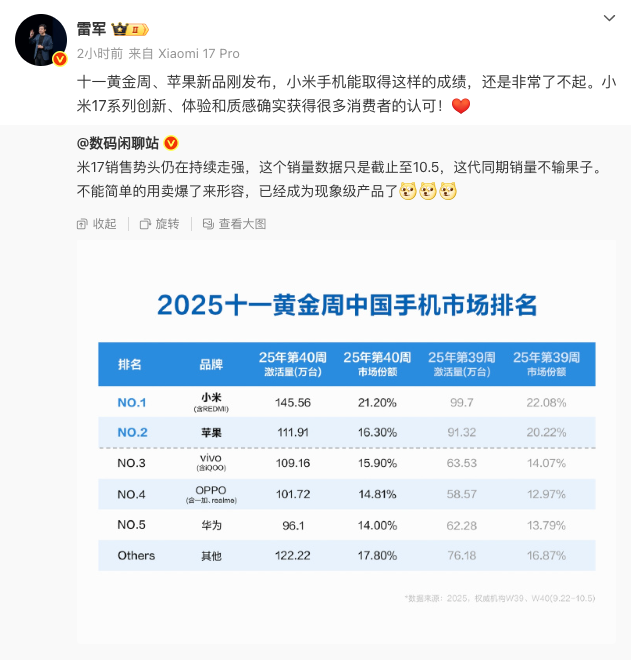对此,小米创办人,董事长兼CEO雷军点评称,“十一黄金周、苹果新品刚发布,小米手机能取得这样的成绩,还是非常了不起。小米17系列创新、体验和质感确实获得很多消费者的认可。”