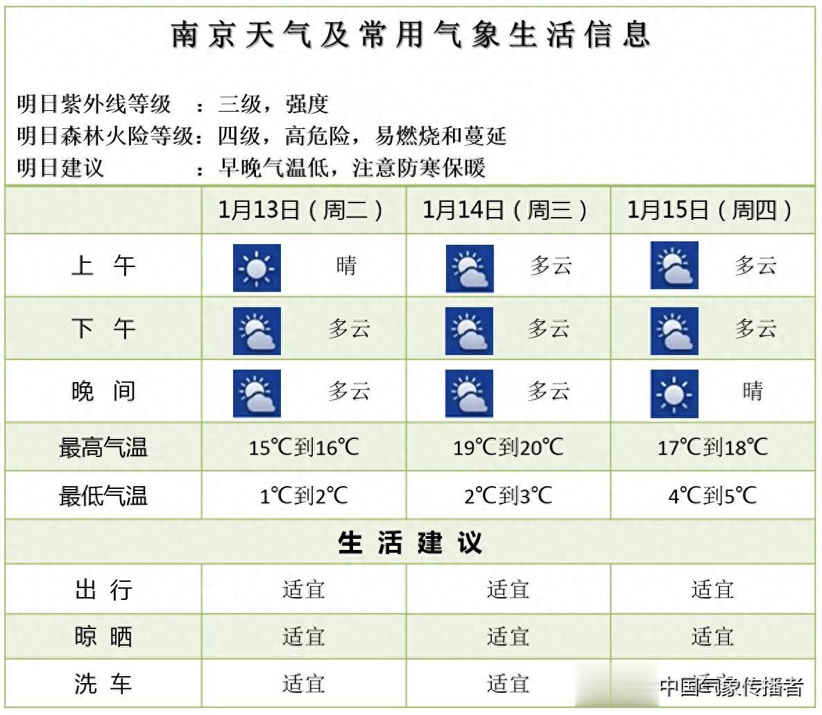 2026年1月中旬,南京的冬日天气走出了“暖春”节奏。根据最新气象信息显示,1月13日至15日,南京以晴到多云为主,最高气温一路攀升至20℃,不过森林火险等级达四级高危险,同时早晚气温偏低,保暖与防火需兼顾。
