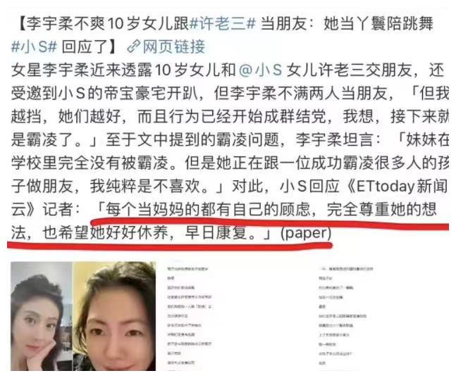 说着大人,怎么又攻击到孩子了呢?就在前几天,小S的小女儿许老三卷入了校园霸凌的风波。女星李宇柔发了一篇长文,爆料许老三霸凌自家女儿的全过程。