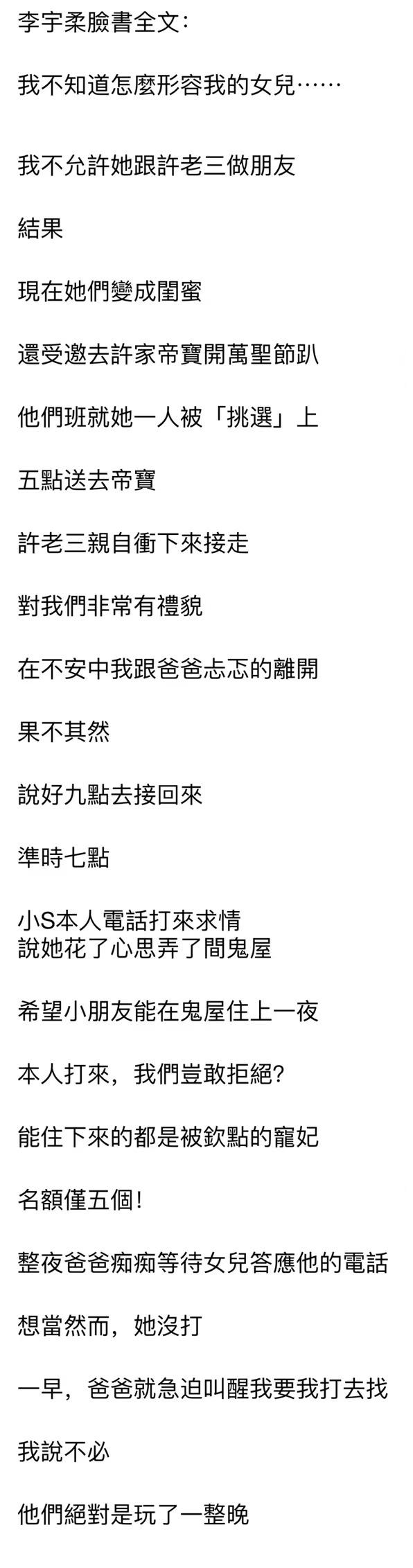 李宇柔还称,以前亲眼看到许老三拉扯同学的头发,最后还是小S出面给家长道歉。李宇柔有病在身,身患癌症,所以她不想女儿和许老三当朋友,不要受欺负。