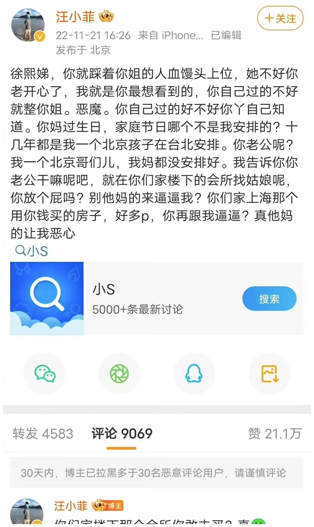 虽然他每次都否认,但大家心知肚明。这次汪小菲就站出来揭开内幕,指出许雅钧在楼下会所找姑娘,自己都见过。一条不够泄愤,还说他用小S的钱在上海卖房子,结果在里面包养了好几个女人,好多P。