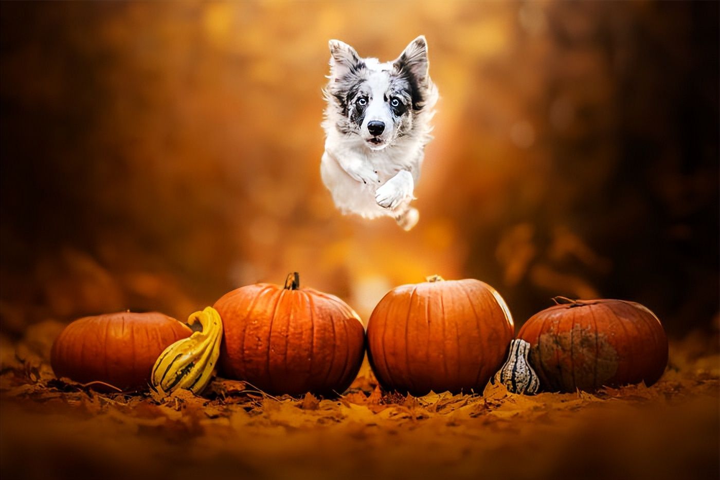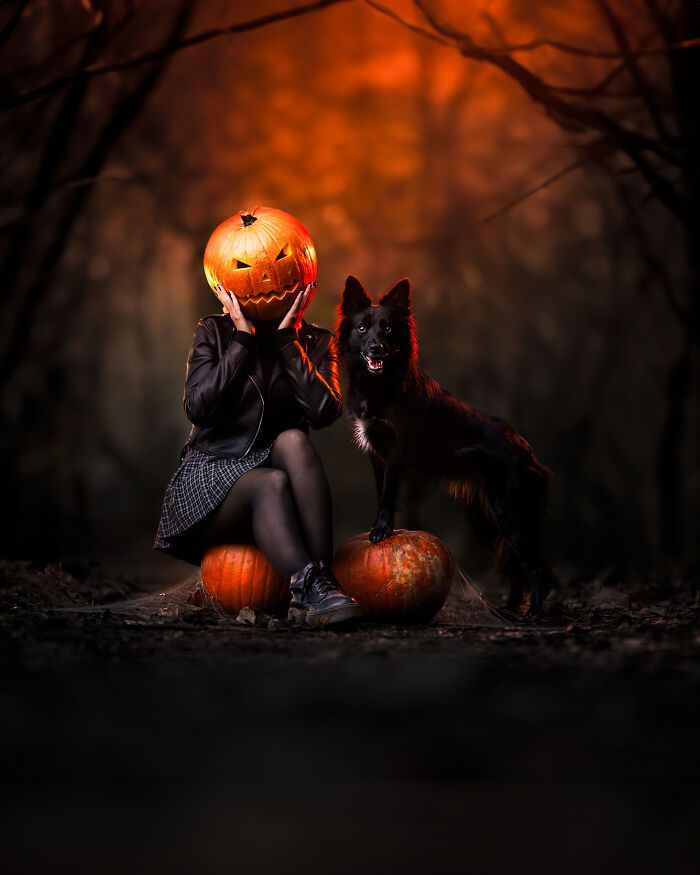 万圣节是她最喜欢的季节之一,充满了舒适的秋日氛围、南瓜和幽灵般的魅力。因此,她将对万圣节的热爱与狗狗摄影结合,创作了一个以万圣节为主题的系列作品。在这些作品中,狗狗在金色的树木和秋叶中与南瓜合影,也在黑暗而神秘的森林中拍摄。