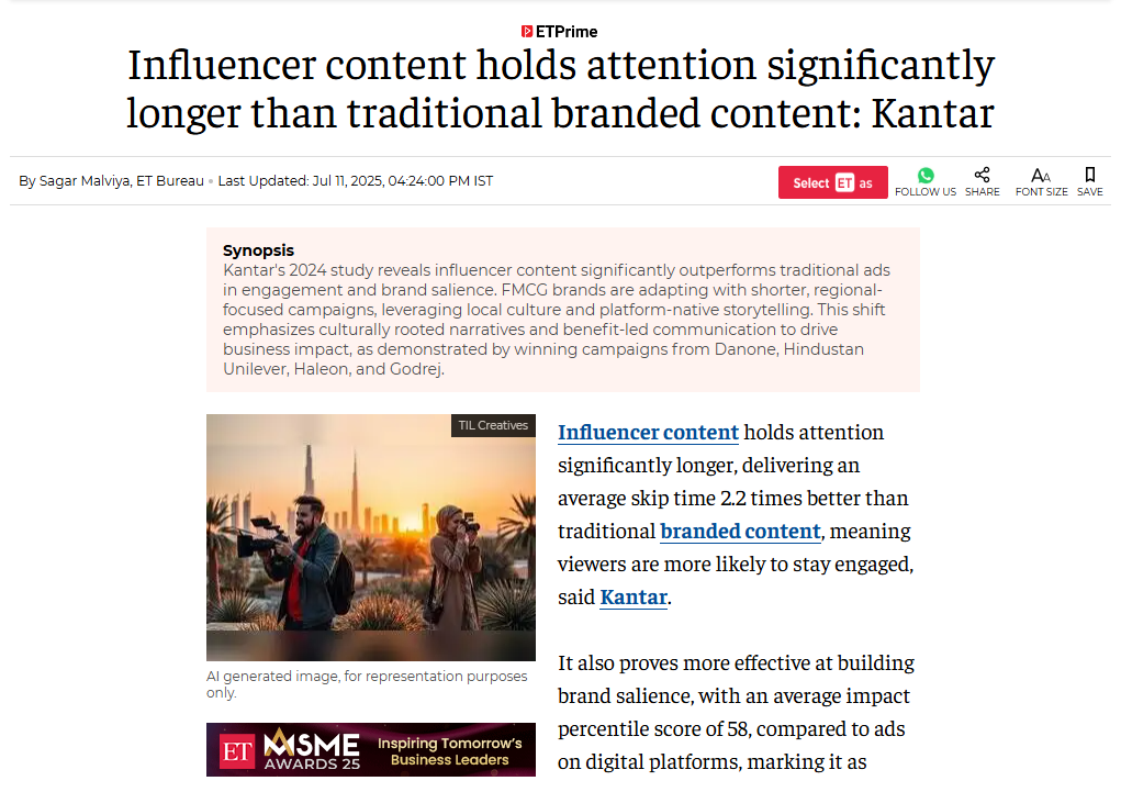在海外社交媒体上,用户对广告的抵触情绪不断上升。相比传统广告,红人创作的内容更容易突破“广告屏障”,获得观众的关注和信任。据一项研究显示,79% 的 18–29 岁用户认为红人创作的内容比传统广告更具吸引力。这种偏好背后,正是用户对真诚表达、个性讲述的渴望:相比于“品牌在说”,他们更愿意听“达人在说”。